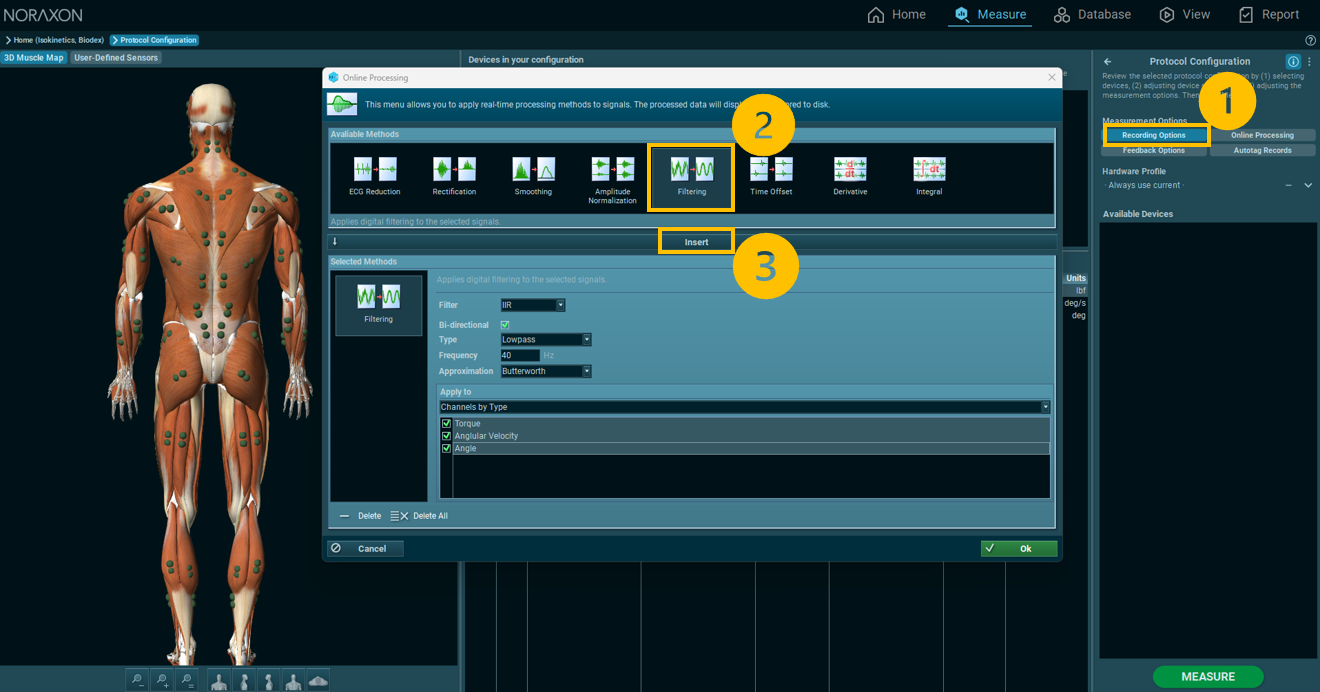 To learn how to add this filter to the real-time capture, follow the steps below to include the lowpass filter in the Protocol Configuration. For more information on how to apply filtering after data collection, reference the article below to learn more about Noraxon’s Signal Processing Tools.