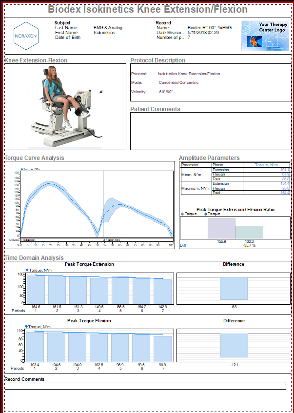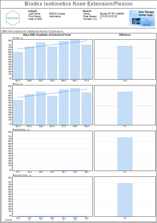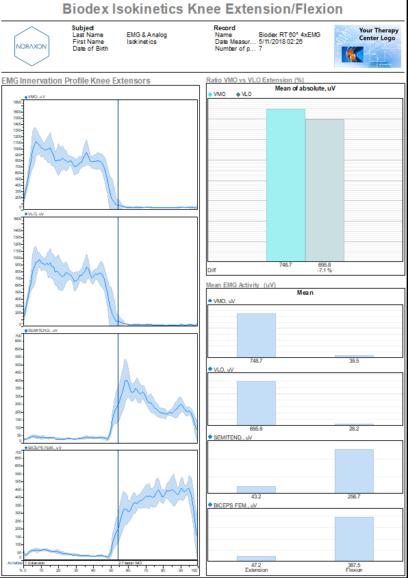 A report for the Biodex are available pre-built into the MR software. If you assigned a report when you created the protocol, the report will be automatically generated. The “Biodex Isokinetics Knee” report is designed for the analysis of synchronized measurement of EMG and biomechanical output signals (torque, angle, velocity) during any isokinetic activity. The isokinetics output signals need to physically connected and integrated into the EMG recording, at minimum the torque and the position signal has to be recorded. The report setup depends on the given Isokinetics device and the predefined report setup may need some adjustments to the given isokinetics system.