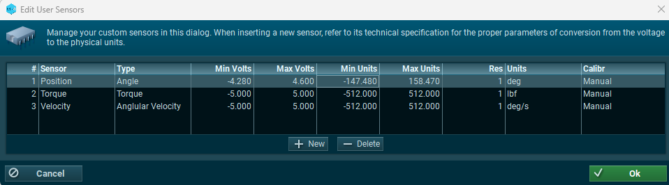 Step 4: Add new sensors to the list, matching the type and units for the Position, Velocity, and Torque channels below.