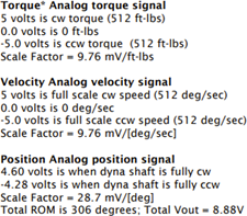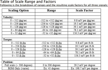 For refernece, the analog scaling factors from the Biodex User Manual are shown below. If your machine is configured differently than the default, you may be required to modify the scaling factors to meet the range specified in your machine’s settings.