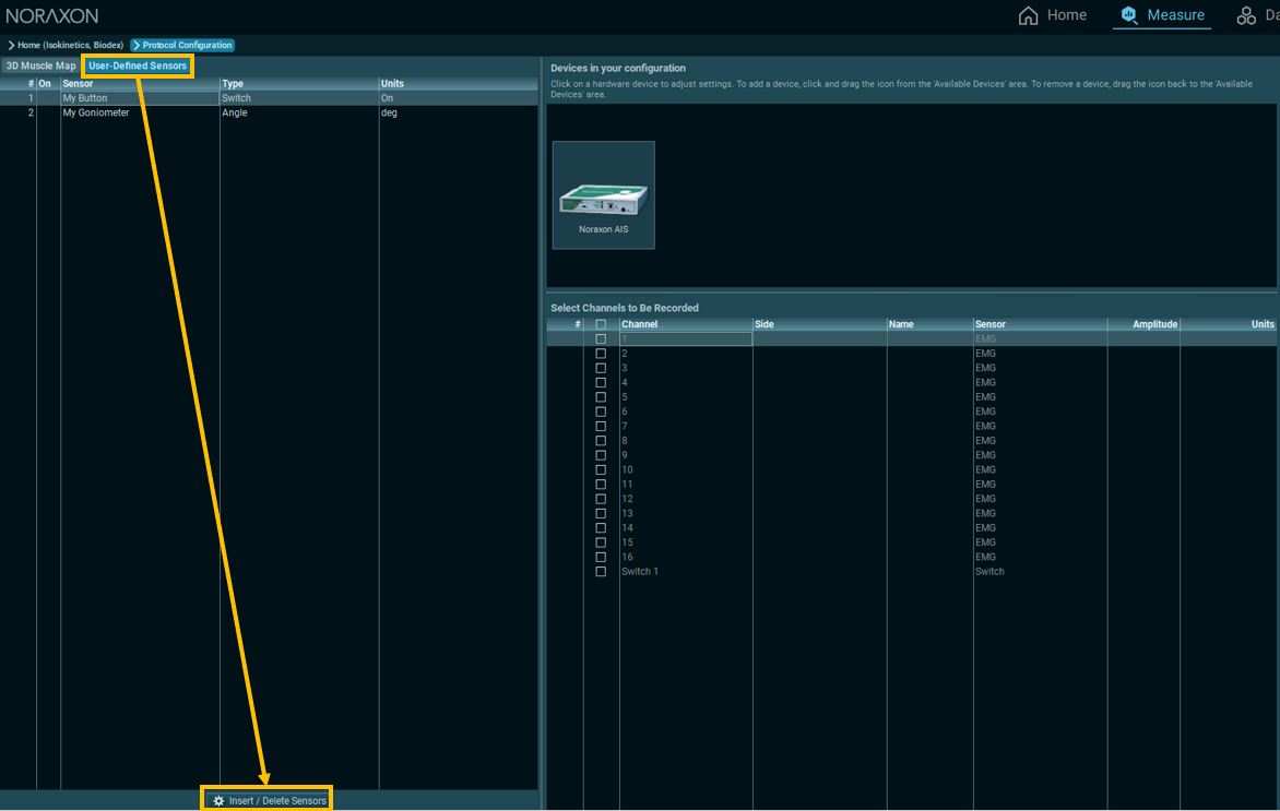 Step 3: Select the User-defined sensors tab and click “Insert/Delete Sensors” to add new sensor channels. This is where the Torque, Velocity, and Angle channels will be added.