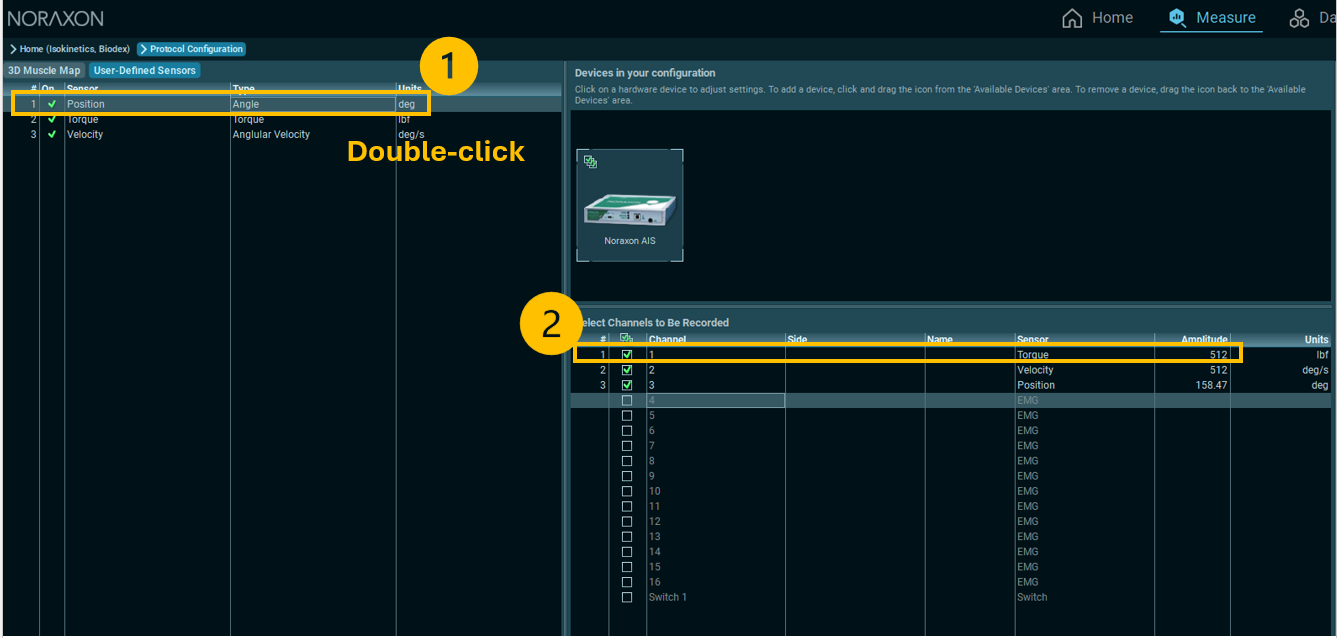 Step 5: Once the user-defined channels are added, assign each sensor to Channels 1-3 by double-clicking on the sensor in the user-defined sensors list when the desired channel in section 2 is highlighted. The channels are assigned as follows: