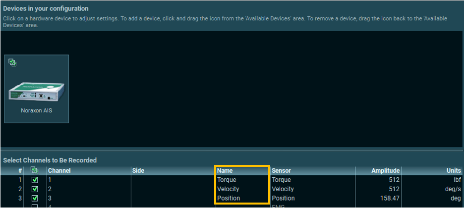 Once assigned, the Sensor, Amplitude, and Units for each channel will be automatically filled in.