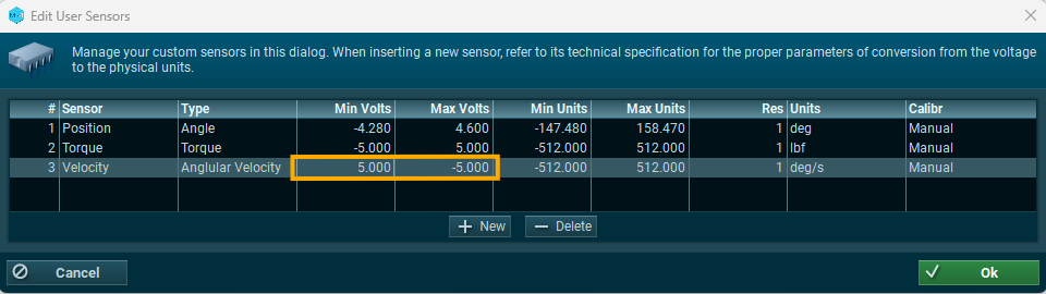 A: Some machines may have the velocity or torque channels flipped in polarity. To account for this in MR, swap the min/max voltage directions in the user-defined sensors setup.