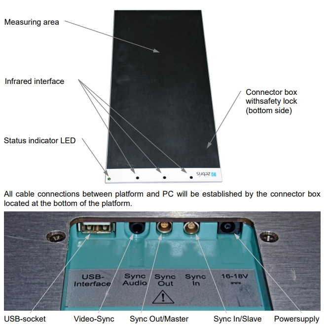 In order to set the FDM-T platform into operation, the power supply unit, the USB type A-B cable, and Zebris sync cable must be connected to the platform according to the diagram below.
